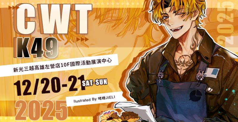 CWT-K49《高雄場》 活動時間│2025年12月20/21日活動地點│新光三越高雄左營店10F國際活動展演中心 活動地址│高雄市左營區高鐵路123號10樓 社團報名時間│06月30日-07月10日社團攤位圖截收時間│08月01日-09月30日活動內容│同人誌販售攤位滿載、等 現場票價│