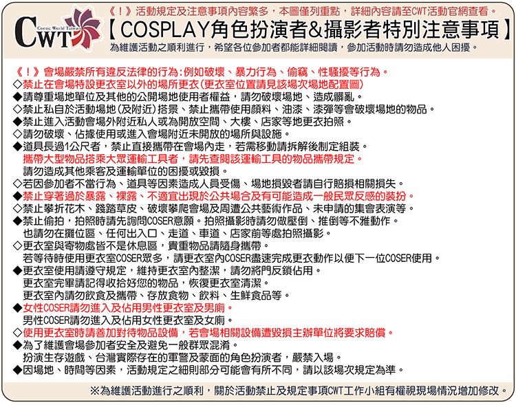 ※為維持活動進行之順利,關於活動禁止及規定事項CWT工作小組有權視現場情況增加修改。