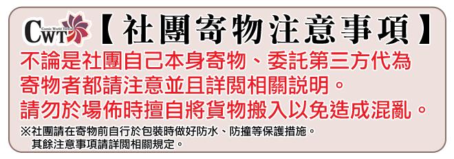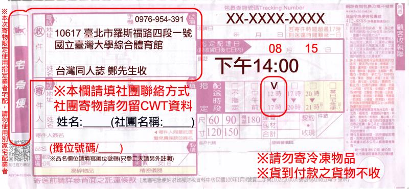 ※台灣社團宅配貨物限定指定業者,不得使用其他貨運或是其他宅配,如因此產生額外費用將由社團自付。
