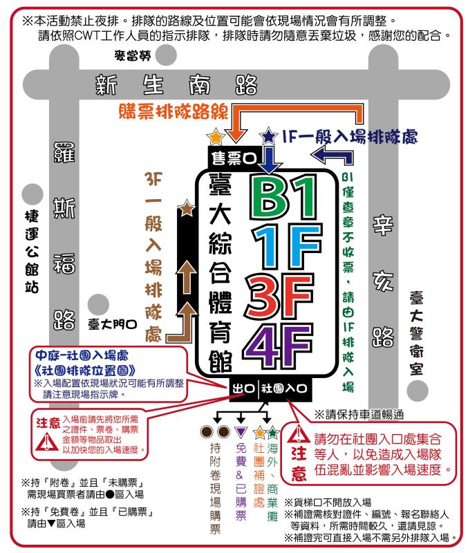 - 補證及社團持附券現場購票者請依規劃動線直接入場,不接受持附券購票後不入場之行為。