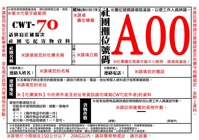 - 因寄至會場貨物數量非常的龐大,除了活動當日社團自己攜帶至會場的貨物之外,所有搬入會場之貨物皆需貼上社團資料表單。